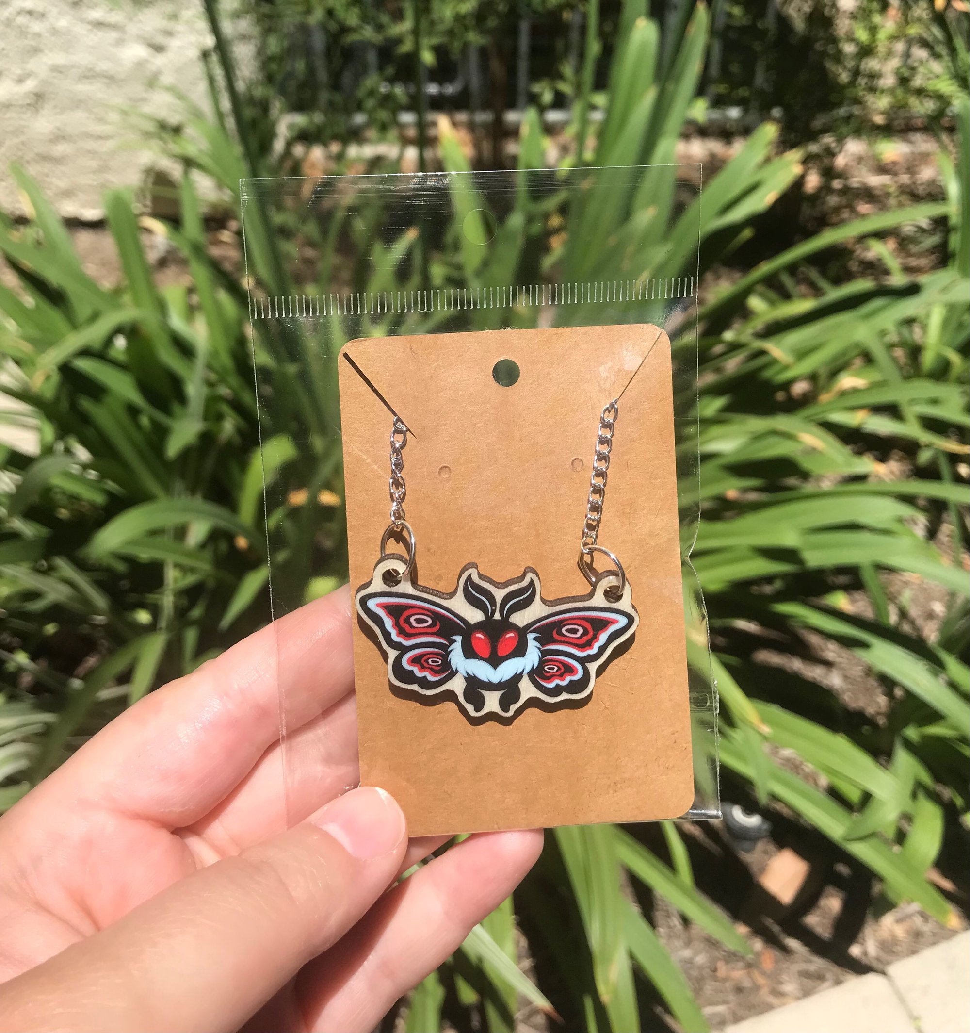 These are 2 inch, wooden pendants, coated with a shiny coat of resin on an 18 inch stainless steel chain link! Swipe to see what it looks like on me! I always keep Mothman near and dear to my heart. ❤️- and so can you! 😉